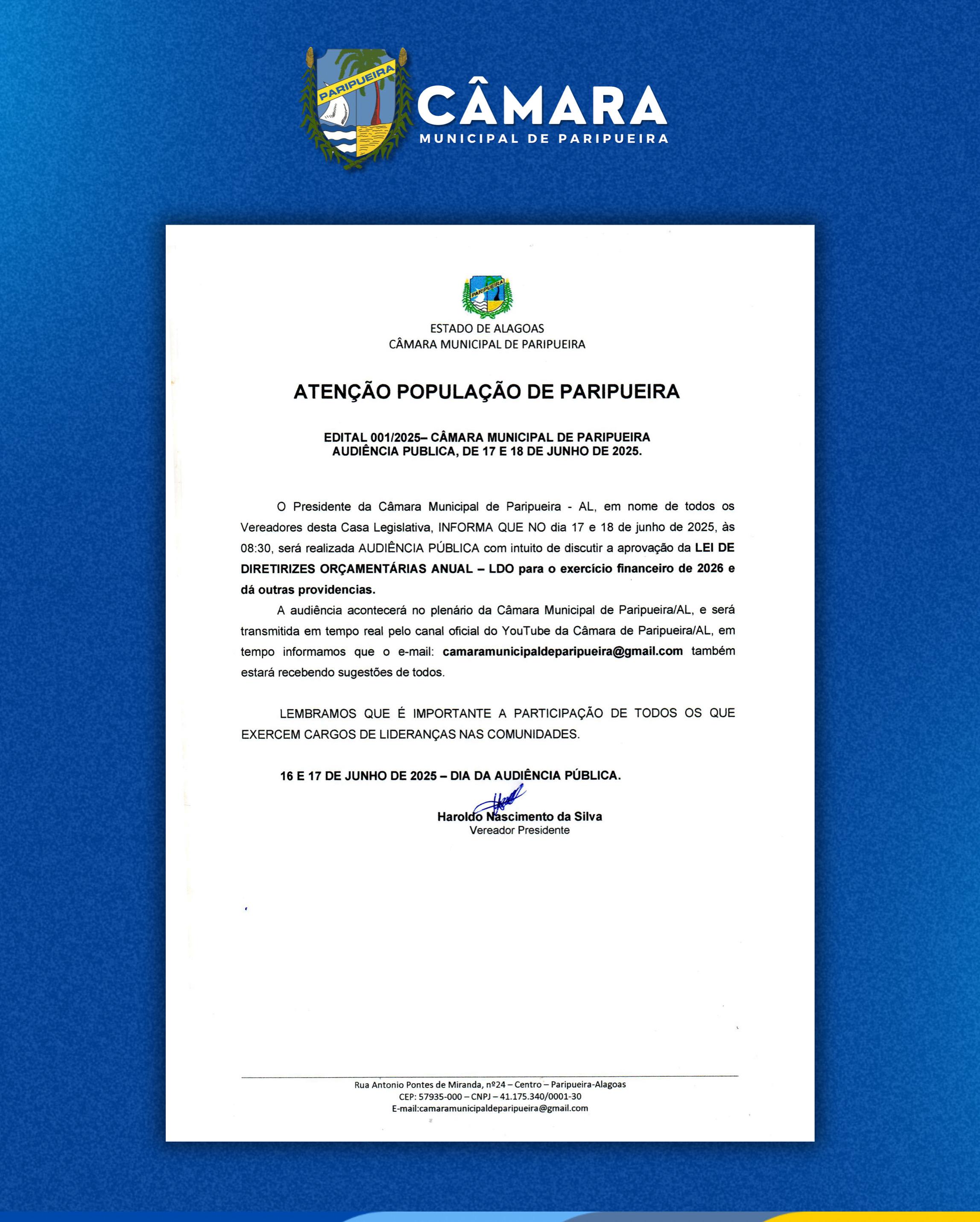 REALIZAÇÃO DE AUDIÊNCIA PÚBLICA REFERENTE A LEI DE DIRETRIZES OOÇAMENTÁRIAS PARA O EXERCICIO DE 2026.